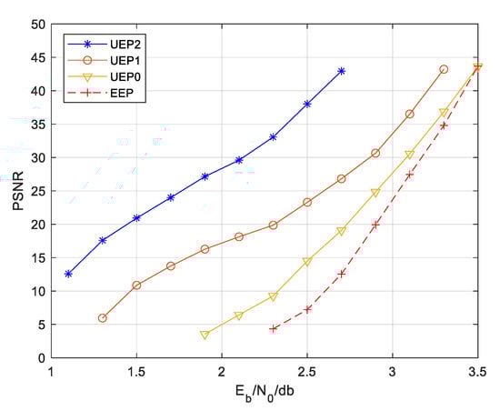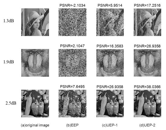 Figure 9 shows the performance of recovery image of the three strategies with , , and . We can see that the recovery image qualities of the UEP-1 and UEP-2 strategies were significantly better than that of the EEP strategy under different SNRs. The UEP-1 and UEP-2 strategies achieved 19 dB and 31 dB peak signal-to-noise ratio (PSNR) gain over the EEP scheme for image ‘Pepper’ at , respectively.