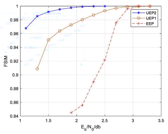 Furthermore, Figure 11 shows the comparison of the feature similarity index measure (FSIM) between the recovery image and original image in three schemes under different SNRs. We can see the FSIM achieved 0.99 at 1.5 dB in the UEP-2 scheme, which is superior to those of UEP-1 and EEP of 1 dB and 1.3 dB, respectively. Moreover, it is interesting to note that the FSIM goes up to the top very quickly in the EEP scheme, compared to the proposed UEP schemes. This is due to that the decimal part of the DCT coefficients focuses on describing the details of the image, and this part of information can be recovered at high the SNR region in the proposed UEP schemes.