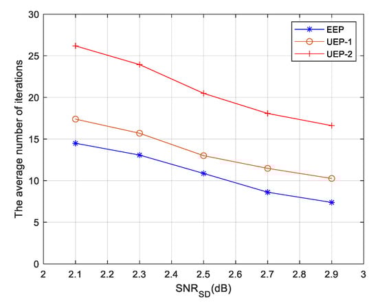 Morever, we show the convergence of the BP decodings by calculating the average number of decoding iterations, as given in Figure 12. It can be observed that UEP-1 had about two more iterations in comparison to EEP, even if extra decoders were added in the relay and the desitination. While UEP-2 had significantly higher iterations than EEP, the main reason is that the relay and the destination need to use more decoding resources to decode the encoding message of the decimal part.