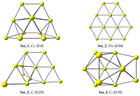 Optimized geometries along with symmetry point groups and relative energies (kcal/mol) of the four lowest-lying Au12 isomers are presented in Figure 1, while their Cartesian coordinates are given in Table S1 of the electronic Supplementary Information (SI) file. Figure 1 includes the 2D isomer Iso_2, which was commonly assumed as the global energy minimum in the current literature [16,17,18,19,20,21,22,23,24,25], and two 3D isomers Iso_1 and Iso_3 that were assigned to have the lowest energy in some other studies (cf. Scheme 1).