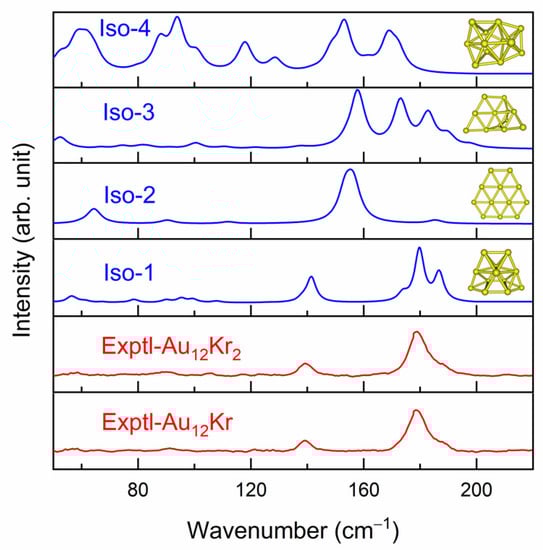 We now examine the vibrational signatures of the lower-lying Au12 isomers in comparison to the experimental spectra recently reported by Goldsmith et al. [24]. Accordingly, the cluster was produced via laser ablation and thermalized to ~100 K and then recorded with the presence of messenger Kr atoms. We thus consider the Au12Krx (x = 1, 2) complexes and find that the Kr atoms tend to anchor on the cornered Au atoms as they are more positively charged than the others (Figure S2). The binding energy of the Kr atom to Au12 amounts to ~0.04 eV (revTPSS/aVDZ-PP). Overall, complexes of Iso_1 remain more stable than those of Iso_2, being ~0.13 eV higher (Figure S3), and the introduction of Kr atoms induces minor changes on the intensities in the low-energy region, while the peak positions remain almost unchanged (Figure S4). Therefore, our analysis on the FIR-MPD spectra is based on the simulated ones of Au12 isomers, as displayed in Figure 2.