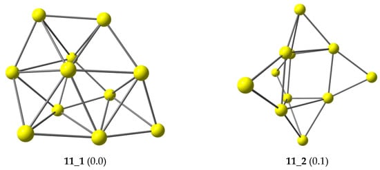Recent FIR-MPD measurements combined with DFT calculations have confirmed that the open-shell Au11 system tends to exhibit a non-planar conformation, i.e., 11_2 in Figure 3, in its ground state [24]. In the present study, we find two lowest-lying isomers competing for the equilibrium geometry of Au11 that are displayed in Figure 3. At the revTPSS/aVDZ-PP + ZPE level, 11_1 is found to be 0.1 eV more stable than 11_2. The same energy ordering is also found by (U)CCSD(T)/aVDZ-PP + ZPE calculations but with a larger energy gap of 0.2 eV in favor of the former. The most stable form Iso_1 of Au12 is indeed obtained by adding one extra Au atom to the lowest-lying isomer 11_1 of the smaller-sized Au11. Such an evolution, which forms the basis for the successive growth algorithm for the structural search, lends further support for the preference of the 3D structure Iso_1 over its 2D counterpart Iso_2.
