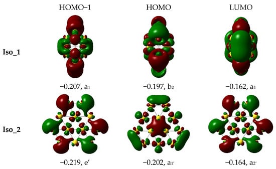 Plots of the frontier orbitals, including HOMO and LUMO, of Iso_1 and Iso_2 isomers are presented in Figure 4. At the revTPSS/aug-cc-pVDZ-PP level, such states of both structures are nearly degenerated in energy. The energies of the HOMO and LUMO in Iso_1 amount to −0.162 and −0.197 a.u., respectively, which are comparable with the corresponding values of −0.164 and −0.202 a.u. in Iso_2. As a result, the total electronic energies of these forms turn out to be almost the same.