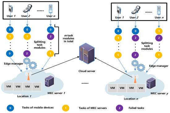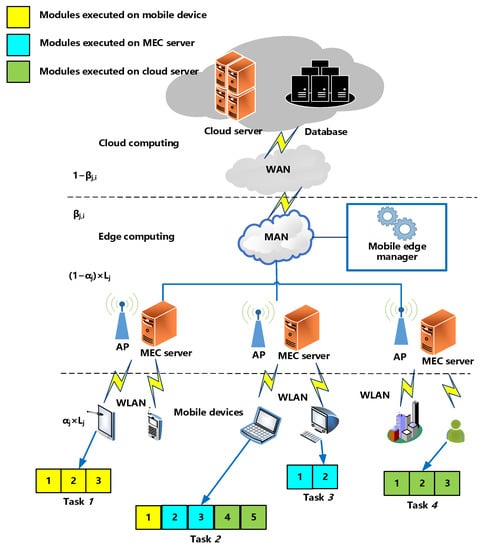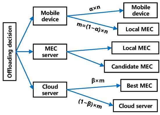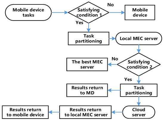 - In the third stage of FLS, if the decision made by FLS is to execute on the best MEC server, there is no need to partitioning tasks at this time. However, if the decision is to offloading to cloud server (called condition 2), the VM of the best MEC server at this time is not enough to process the whole tasks, but it can still process parts of modules of the tasks. Therefore, MEM will divide the task according to the optimal task partitioning rate of stage 2. Assuming that the number of modules of the task is , and the optimal task partitioning ratio of stage 2 is , thus modules of tasks will be executed on the best MEC server picked by the second stage of FLS, and the rest modules of tasks will be executed on cloud server. When the entire tasks are complete, the final output data will be transmitted back to the local MEC server.