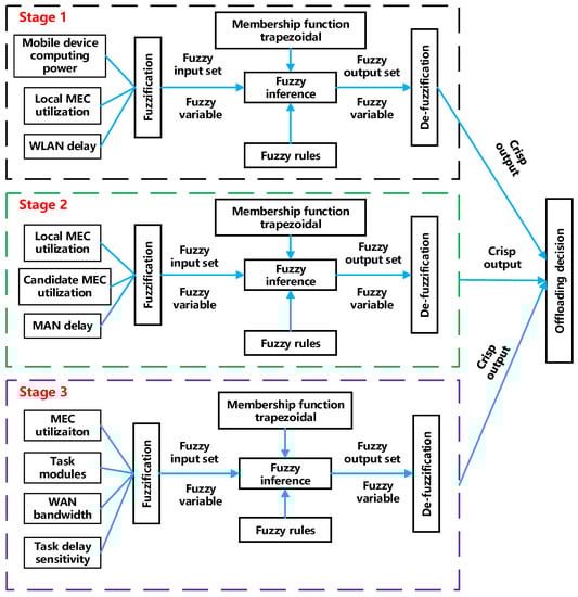 - The three-stage fuzzy logic system is applied in the MEC network architecture, which takes into account network delay such as WLAN and MAN, remaining computing capacity of mobile devices, MEC and cloud servers, and task attributes to offload tasks that cannot be operated by mobile devices to appropriate locations.