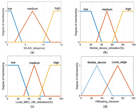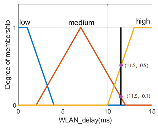 - The first step is fuzzification. For each input parameter, the clear input set will be converted into the fuzzy input set according to the membership function corresponding to this variable. There are many forms of membership function, such as triangular, gaussian, and trapezoidal form. In this paper, the trapezoidal form is selected (since two out of four points coincide, the medium broken line becomes triangular). Secondly, determining the membership function of each input variable and output variable is critical because it has a great impact on FLS performance. In this paper, the membership function of each fuzzy variable is determined according to paper [25]. As shown in Figure 5, for WLAN delay (represented by ), if a clear input value is 11.5, a vertical line is drawn at the abscissa 11.5, and the ordinate values of the three intersecting points of membership function are 0, 0.1, and 0.5, respectively, then the fuzzy variable after transformation of the clear input value 11.5 is .