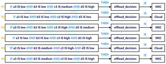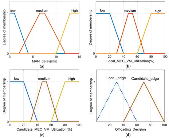 - In the second step of reasoning, it is assumed that only two rules, R1 and R2, are defined in the rule set. If the WLAN delay, mobile device utilization, and local MEC VM utilization are 1 ms, 40%, and 80%, respectively, then Equation (4) can be used to calculate the fuzzy value for selecting local MEC server or not.where:After substituting the specific values, we can obtain:
