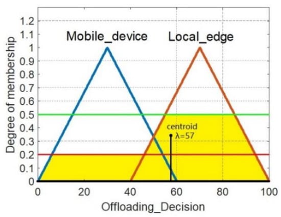 - The third step is de-fuzzification. De-fuzzification denotes to de-fuzzify output fuzzy variables obtained in step 2 according to offloading decision membership function. There are many ways to de-fuzzify a fuzzy number, among which centroid method is the most commonly used. The specific process is shown in Figure 7. If the fuzzy variable obtained is [0.2, 0.5], the corresponding region of mobile device is filled from the bottom up to the position of 0.2. Similarly, fill the area corresponding region to the local MEC server to the position of 0.5, then calculate the centroid of the yellow area in Figure 7, the abscissa λ is 57, if λ is greater than 50, then the final offloading decision is the local MEC server.