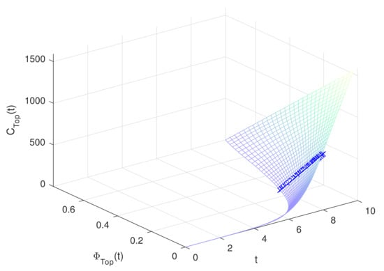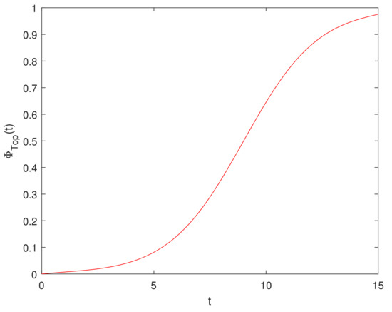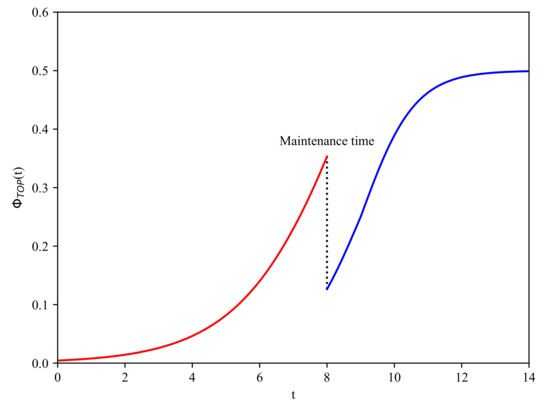 where is calculated by Equation (6), is calculated by Equation (8), and is the given allowable risk level of the system at time t. Since the uncertain fault tree structure function is monotonic non-decreasing, the range of is usually in