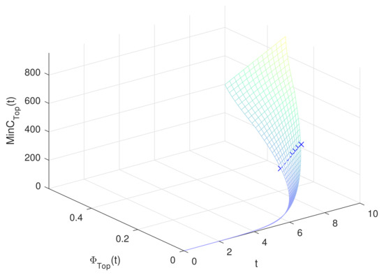 The aim of the single-objective optimization model is to determine the maintenance strategy at any time t when the total maintenance cost is minimized under the risk constraints. Denote the system risk at time t by . It is easy to see that is the function of . Then, the single-objective maintenance optimization model is established by
