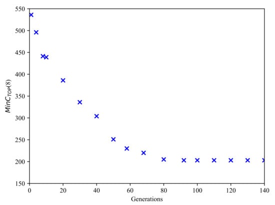 Take the situation of the subsea production system in the eighth year as an example. The relationship between the number of generations and Min is shown in Figure 5. It is easy to see that with the increase in the number of generations, the value of Min converges gradually. When the number of generations reaches 80, the value of Min has stabilized. Then, the number of generations in GA is set to 100.