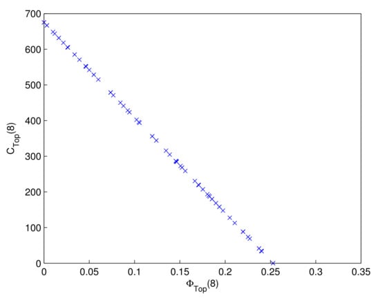 The multi-objective optimization model can be solved by NSGA-II. The key parameters of the NSGA-II are assigned as follows: the population size is 100, the crossover probability is 0.5, the mutation probability is 0.01, and the number of generations is 120. In Figure 6, the relationship between maintenance time t, and is presented, in which “×” denotes the optimized non-dominated solution set in the eighth year. In order to show the optimized non-dominated solution set of the eighth year more clearly, Figure 7 is given. In particular, when the point in Figure 7 is selected, one of the optimal maintenance strategies is shown in Table 5.