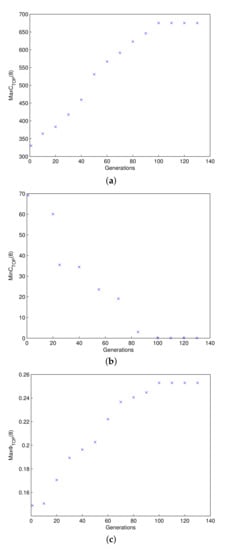 Take the situation of the subsea production system in the eighth year as an example. The ranges of and with the growth of generations is shown in Figure 8. It is easy to see that with the increase in the number of generations, the values of Max , Min , and Max converge gradually. When the number of generations reaches 100, the values of Max , Min , and Max have stabilized. The minimum value of Min is always around 0.067. Therefore, the number of generations in NSGA-II is set to 120.