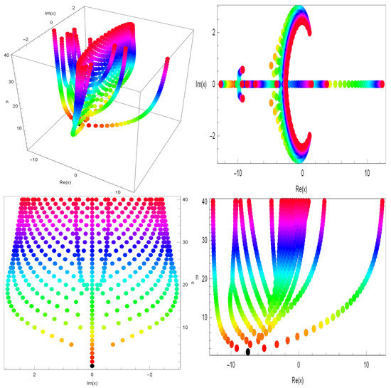 The stacks of zeros of the q-Cosine -array-type polynomials for , forming a 3D structure, are presented in Figure 2.