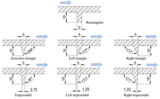 - Zheng, D.; Wang, X.; Yuan, Q. The flow and heat transfer characteristics in a rectangular channel with convergent and divergent slit ribs. Int. J. Heat Mass Transf. 2019, 141, 464–475. [Google Scholar] [CrossRef]