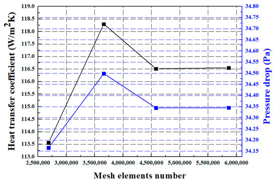 The computational domain is meshed with tetrahedral mesh elements with different element sizes of 2.3 mm, 2.5 mm, 2.7 mm and 3.0 mm. The inflation layers are provided in the fluid domain to consider the effect of boundary layers near the ribs. The specifications of inflation are a number of layers of 5, a transition ratio of 0.4 and a growth rate of 1.2. Furthermore, to incorporate the impact of vortices generated in the air flow near the ribs, these sections are meshed with finer mesh elements of a size of 0.8 mm. The mesh independency test is conducted considering four element sizes for computational geometry in order to assure the balance between computational time and accuracy [25]. The mesh independency test is performed for divergent ducts with all rib shapes; however, the results for the divergent duct with the rectangular rib shape is depicted in Figure 3, which is the same as the experimental geometry. The mesh independency test is performed at an inlet air temperature of 304.15 K and the maximum inlet velocity corresponding to the Reynolds number of 79,000. The number of elements corresponding to four element sizes are depicted in Table 1. The heat-transfer characteristics of the heat-transfer coefficient and pressure drop are simulated for various element numbers. The simulated results for various mesh-element numbers are shown in Figure 3. Beyond the mesh-element number of 4,579,698, the simulated results of the heat-transfer coefficient and pressure drop converge. Hence, the mesh-element number of 4,579,698 is adopted for computational geometry in further simulations. The meshing for the computational domain of the divergent duct with the rectangular rib shape is shown in Figure 4. The meshing depicted in Figure 4 is adopted with a mesh-element number of 4,579,698 after the mesh independency test.