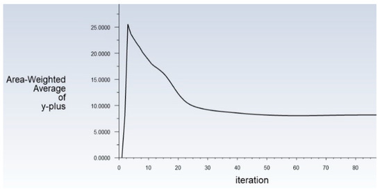 One of the values that describes the mesh quality used for simulating fluid flow is a non-dimensional distance between the examined duct wall and the initial mesh node and is denoted as y+. Thus, for obtaining more accurate results, the y+ number should be in range from 1 to 10 [26]. In the present simulation, for the adopted mesh, the y+ number is 8, as shown in Figure 5, which is in the acceptable range.