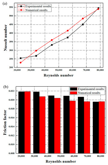 Comparison between experimental and numerical results for (a) Nusselt number and (b) friction factor.
