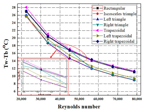 The variation in the difference between the wall temperature and the fluid temperature with the Reynolds number for divergent ducts with various rib shapes is shown in Figure 7. A greater difference between the wall temperature and the air temperature indicates that the air carries a lower amount of heat when passing from the inlet to the outlet of the duct, whereas a smaller difference between the wall temperature and the air temperature indicates that the air absorbs a greater amount of heat while moving from the inlet to the outlet of the duct. The heat-transfer rate is maximum at higher Reynolds numbers because of the increase in turbulence, which indicates that the temperature difference between wall and air is greater at lower Reynolds numbers and decreases with the increase in the Reynolds number. Xie et al. showed the same results of the decrease in the difference between the wall temperature and the fluid temperature with the increase in the Reynolds number [35]. The smallest temperature difference is observed for the isosceles triangle followed by the left trapezoid, right triangle, left triangle, rectangle, right trapezoid and trapezoid, respectively, in increasing order. For the Reynolds-number range of 22,483–78,559, the temperature differences range from 11.10 °C to 26.95 °C, from 8.99 °C to 25.67 °C, from 9.03 °C to 25.97 °C, from 9.07 °C to 25.93 °C, from 11.38 °C to 28.07 °C, from 9.49 °C to 25.69 °C and from 11.27 °C to 27.13 °C for the rectangular, isosceles-triangular, left-triangular, right-triangular, trapezoidal, left-trapezoidal and right-trapezoidal rib shapes, respectively.