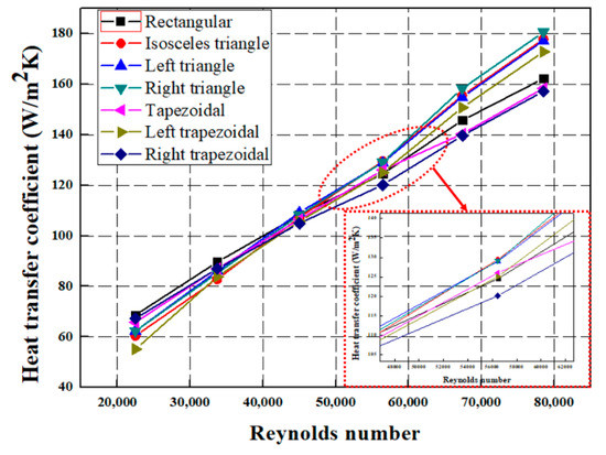 The heat-transfer coefficient for divergent ducts with various rib shapes is compared in Figure 8. The variation in the heat-transfer coefficient is presented with the Reynolds number for all rib shapes. The heat-transfer coefficient increases when the heat transfer from the duct to the air increases through conduction and convection. The air absorbs more heat at higher Reynolds numbers owing to the increase in the degree of turbulence, which results in a smaller temperature difference between wall and air and thus an enhancement in the heat-transfer coefficient. The increase in the Reynolds number creates a higher degree of turbulence, which results in an enhancement in the heat gain when air passes from the inlet to the outlet of the duct for all rib shapes. Therefore, the divergent duct with each rib shape shows an increase in the heat-transfer coefficient with the increase in the Reynolds number. With the increase in the Reynolds number from 22,483 to 78,559, the heat-transfer coefficients increase from 68.68 W/m2K to 162.30 W/m2K for the rectangular rib shape, from 60.42 W/m2K to 177.87 W/m2K for the isosceles-triangular rib shape, from 62.31 W/m2K to 177.25 W/m2K for the left-triangular rib shape, from 62.31 W/m2K to 180.65 W/m2K for the right-triangular rib shape, from 65.77 W/m2K to 158.42 W/m2K for the trapezoidal rib shape, from 55.18 W/m2K to 172.87 W/m2K for the left-trapezoidal rib shape and from 67.31 W/m2K to 157.21 W/m2K for the right-trapezoidal rib shape. The obstruction of air flow in the case of the right-triangular rib shape imposes a larger degree of turbulence than other rib shapes. Therefore, a superior heat-transfer rate is depicted by the divergent duct with the right-triangular rib shape compared with those obtained with other rib shapes. The maximum heat-transfer coefficient is depicted for the right-triangular rib shape followed by the isosceles-triangular, left-triangular, left-trapezoidal, rectangular, trapezoidal and right-trapezoidal rib shapes, respectively, in decreasing order. Javadi et al. concluded that the triangular rib shape in the case of a constant cross-section duct showed better thermal performance than the rectangular, square and trapezoidal rib shapes [4].