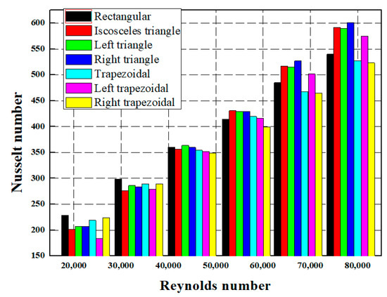 The Nusselt-number comparison for divergent ducts with various rib shapes under influence of the Reynolds number is depicted in Figure 9. The Nusselt number depends on the heat-transfer coefficient; hence, a higher heat-transfer coefficient results in higher Nusselt numbers, and the decrease in the heat-transfer coefficient results in lower Nusselt numbers. The rib shape that shows the highest heat-transfer coefficient has the highest value of the Nusselt number. Therefore, the trends of the variation in the Nusselt number are same as those of the heat-transfer coefficient for all rib shapes. The right-triangular rib shape shows the highest value of the Nusselt number, followed by the isosceles-triangular, left-triangular, left-trapezoidal, rectangular, trapezoidal and right-trapezoidal rib shapes, respectively, in decreasing order of the Nusselt number, because the heat-transfer coefficient for these rib shapes decreases in the same order of the decrease in the heat-transfer rate. The Nusselt number increases with the increase in the Reynolds number because of the increase in the heat-transfer coefficient for all shapes. The Nusselt numbers increase in the ranges from 228 to 540, from 201 to 592, from 207 to 590, from 207 to 601, from 219 to 527, from 184 to 575 and from 224 to 523, for the rectangular, isosceles-triangular, left-triangular, right-triangular, trapezoidal, left-trapezoidal and right-trapezoidal rib shapes, respectively, over the Reynolds-number range from 22,483 to 78,559. Taslim and Wadsworth also showed the same trend of the Nusselt number with the Reynolds number; with the increase in the Reynolds number, the Nusselt number of square channels with ribs increased [36].