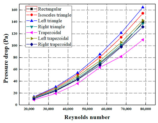 The comparison of the pressure drop for divergent ducts with various rib shapes over the variation range of the Reynolds number is presented in Figure 10. As mentioned, the increase in the Reynolds number increases the degree of turbulence of air flow in the duct, which results in the increase in heat transfer at the cost of the increase in the pressure drop. This is the reason for the increase in the pressure drop for all rib shapes with the increase in the Reynolds number. The trapezoidal rib shape creates a lower degree of turbulence for air flow, which results in the lowest pressure drop, whereas the left triangle depicts the maximum pressure drop owing to the greater turbulence generated by this rib shape. All other rib shapes present turbulence degrees between the left-triangular and trapezoidal rib shapes; hence, the pressure drops for these rib shapes lie between maximum and minimum values imposed by the left-triangular and trapezoidal rib shapes, respectively. In the variation range of the Reynolds number from 22,483 to 78,559, the pressure drops for the rectangular, isosceles-triangular, left-triangular, right-triangular, trapezoidal, left-trapezoidal and right-trapezoidal rib shapes are from 10.8 Pa to 139.1 Pa, from 13.0 Pa to 154.52 Pa, from 13.9 Pa to 164.5 Pa, from 11.8 Pa to 137.3 Pa, from 8.9 to 109.9 Pa, from 12.7 Pa to 142.5 Pa and from 10.5 to 131.6 Pa, respectively. Ali et al. showed an increment in the pressure drop with the increase in the Reynolds number; the pressure drop increased from 30 kPa to 120 kPa with the rise in the Reynolds number from 100 to 350 [7].
