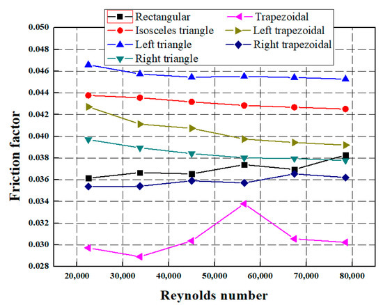 The behavior of the friction factor over the variation range of the Reynolds number for divergent ducts with different rib shapes is shown in Figure 11. For each rib shape, the variation trend of the friction factor is not the same as that of the pressure drop, because the friction factor depends on the pressure drop as well as the velocity of air. There is no specific increasing or decreasing trend for the friction factor with the Reynolds number for the various rib shapes. The left trapezoid shows a decrease in the friction factor as the Reynolds number increases, whereas there is a critical Reynolds number for the trapezoidal rib shape, where the friction factor is maximum. The pressure drop is lower for the trapezoidal rib shape, which results in the lowest values of the friction factor over the entire range of Reynolds numbers. The maximum friction factor is evaluated for the left triangle because of the higher pressure drop over the variation range of the Reynolds number. Over the variation range from 22,483 to 78,559 for the Reynolds number, the friction factors vary in the ranges from 0.036 to 0.038, from 0.043 to 0.044, from 0.045 to 0.047, from 0.038 to 0.040, from 0.029 to 0.034, from 0.039 to 0.043 and from 0.035 to 0.037 for the rectangular, isosceles-triangular, left-triangular, right-triangular, trapezoidal, left-trapezoidal and right-trapezoidal rib shapes, respectively. Taslim and Korotsky also claimed that there exists a critical point for the Reynolds number where the friction factor is maximum [3].