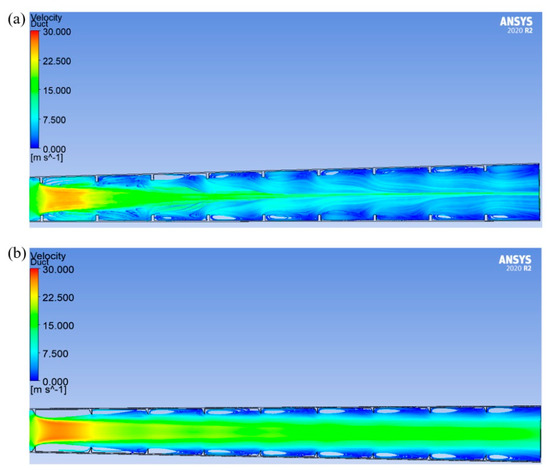 The discussion presented in Section 3.2 and Section 3.3 above indicates that the divergent duct with the right-triangular rib shape shows excellent thermal performance characteristics with superior values of heat-transfer coefficient and Nusselt number among all rib shapes. Furthermore, the pressure drop for the divergent duct with the right-triangular rib shape is higher than that with the trapezoidal and right-trapezoidal rib shapes; however, it is lower than those obtained with all other rib shapes. Hence, the trade-off comparison between thermal and flow performance characteristics shows that the divergent duct with the right-triangular rib shape is the best configuration to achieve enhanced heat-transfer performance. For better visualization, the comparison of the velocity streamlines for the divergent duct with the rectangular and right-triangular rib shapes is depicted in Figure 12. The flow is superiorly developed in the case of the divergent duct with the right-triangular rib shape compared with the rectangular rib shape. However, a symmetrical velocity distribution is observed for both rib shapes. The degree of turbulence is higher in the case of the right-triangular rib shape owing to the velocity in the flow region being higher than in the rectangular rib shape.