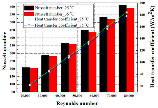 The influence of the change in the inlet air temperature is evaluated on the thermal characteristics of the best configuration, i.e., the divergent duct with the right-triangular rib shape. The behaviors of the heat-transfer coefficient and the Nusselt number are investigated as thermal characteristics. The flow characteristics do not significantly change with the change in the inlet air temperature; hence, this is not elaborated in this section. The variations in the heat-transfer coefficient and the Nusselt number with the Reynolds number for various inlet air temperatures are depicted in Figure 13. A fluid at lower temperatures has higher potential to absorb heat than a fluid at higher temperatures, because a greater temperature difference is created by the fluid at lower temperatures, which results in a greater driving force for heat transfer. This is the reason for the decrease in the convective heat-transfer rate as the fluid temperature increases. Air at the inlet temperature of 25 °C carries a greater amount of heat when passing through the duct than air at the inlet temperature of 35 °C. Hence, the heat-transfer coefficient and the Nusselt number are superior at the lower inlet air temperature of 25 °C. In addition, the heat-transfer coefficient and the Nusselt number increase with the increase in the Reynolds number for both inlet air temperatures, because the heat-transfer rate improves with the increase in the Reynolds number. However, the difference between the heat-transfer coefficient and the Nusselt number corresponding to both inlet temperatures is smaller at lower Reynolds numbers, and it becomes significant as the Reynolds number increases as a result of the increase in turbulence. At higher Reynolds numbers, the heat-transfer coefficients are evaluated as 184.26 W/m2K and 178.09 W/m2K, and the Nusselt numbers are evaluated as 613 and 592 for inlet air temperatures of 25 °C and 35 °C, respectively.