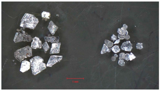 Morphological separation of new crystals was done using an optical microscope with ×32 magnification (Stereoscopic microskope MBC1, Optical Factory, Lytkarino, Moscow, 1971, USSR). Transparent colorless flattened crystals with habitus similar to hexagons were found in crystallization products in the first experiment. The crystals presented in the experiment were well-faceted and sufficiently large, with sizes up to 1 mm, and obviously identical to each other. The yield of the experiment was close to ~90%. In the second experiment, crystals were similar to the first: colorless, well-faceted, but significantly smaller and more isometrically shaped, but with the same yield; see Figure 1.