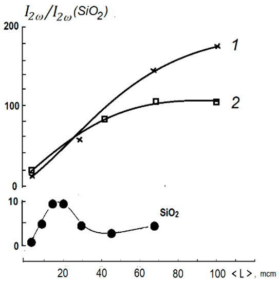 Powder samples for the SHG were prepared from crystals of both aforementioned experiments obtained under various conditions in hydrothermal synthesis (see description above). After grinding, the powders were separated with sieves according to a main grain size of 30–100 mcm, except for the finest powder. The last fraction was prepared by prolonged grinding of powders in alcohol until a suspension was formed. This fraction from 5 mcm grains after drying was used for quantitative comparison of their SHG activity with α-quarts standard. For both experiments, the dependence of SHG response on grain size is typical for phase-matching materials [9]. Stronger SHG was observed in the first experiment (Figure 2) as the grains become larger: evidence for better conditions for phase-matching in a more-ordered structure (see below). Nevertheless, fundamental optical nonlinearities of both experiments are almost equal, as it follows from SHG in the smallest size fractions. The intensity Q = I2ω/I2ω (SiO2) of optical second harmonic generation (SHG) in thin powder with grains of size l = 5 mcm is almost the same (Q = 15 and 17 in I2ω(SiO2)-units correspondingly for both experiments). According to the simplified relation from [9]: