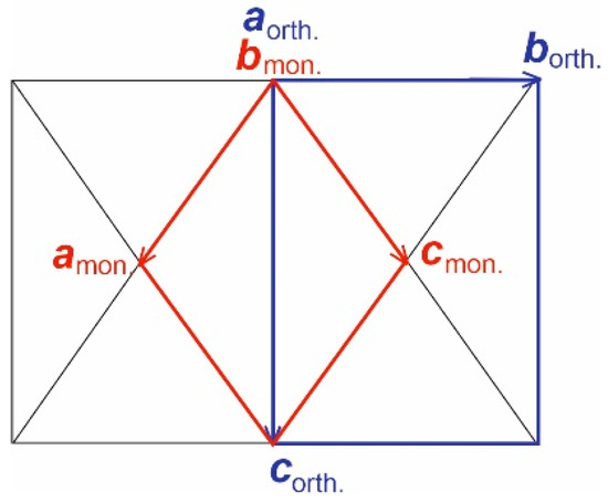 Monoclinic P-lattice (red) selected from the orthorhombic F-lattice (blue).