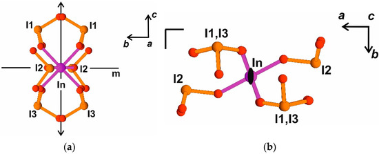 [In(IO3)6]3− block in K3In(IO3)6 crystal structure, local symmetry elements: pseudo-mirror plane m and twofold axis 2 are shown. (a) bc projection, here and after ball-stick presentation is used for (IO3)-groups and In(Sc) atoms; (b) ab projection.
