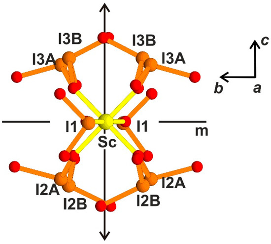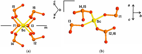 [Sc(IO3)6] 3−block in Rb3Sc(IO3)6 crystal structure, local symmetry element: pseudo-mirror plane m is shown (a) ac projection along monoclinic axis; (b) diagonal ac projection in the same view as in Figure 3b.
