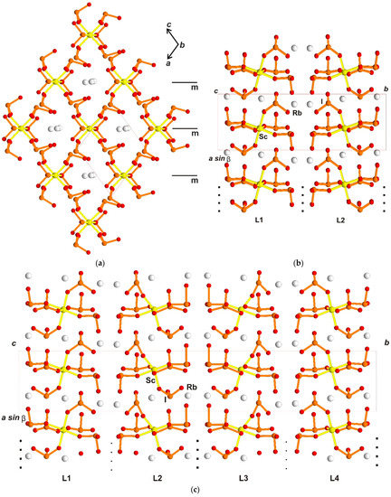 The described blocks are multiplied by diamond d-glades parallel to ac and bc in orthorhombic structures, and by c-glade (correlates with one of d-glade) parallel to the ac-plane in monoclinic structures. The blocks with the triples of Rb atoms are organized in “layers” parallel to ac of symmetry Pm, which is out of space group Pc (Figure 8a) as a local symmetry. Layer alternation along large b-axis and the monoclinic structure with 20 Å is shown on the Figure 8b. Every layer is multiplied to the next one by c-glade of space group Pc with resulting two layers along b-axis in the unit cell; polar direction in every layer corresponds to a [101] vector, and lies inside layers despite layer multiplication happening in a non-polar way. It was described in OD theory as a special case (category Ib [5]). The structure with the doubled unit cell of 40 Å (Figure 8c) possesses, already, four layers in the unit cell. Two layer pairs, namely L4−L1 and L2−L3, are multiplied by real c-glades of the space group; other pairs L1−L2 and L3−L4 are multiplied by pseudo-c-glade; the difference is shown in Figure 6c. Analysis of structure in the large unit cell demonstrates some disorder for the central part of the structure (layers L2−L3), which gives doubling of the b-axis. It is necessary to emphasize that, in the first experiment, predominate crystals with a structure corresponding to axis b = 20 Å.