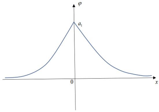 In this subsection, we firstly prove the orbital stability of peakons for when . In addition, the profile of peakon for has been shown in Figure 3. For the sake of simplicity, we consider proving the orbital stability of the following form of peakon: