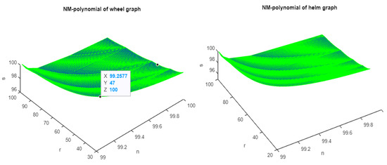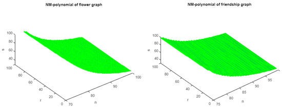 Figure 1, Figure 2 and Figure 3 show the 3D plots of the NM-polynomial of the wheel, helm, gear, flower, and friendship graphs.