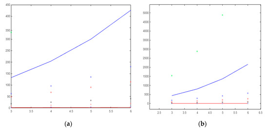 If it is compared, topological indices depend on the sum of the neighboring degrees of the wheel graph; the index has a very large value and creates a very fast curve, while has the lowest value. Although the index is close to the index, it has larger values and creates a faster curve (see Figure 4a).