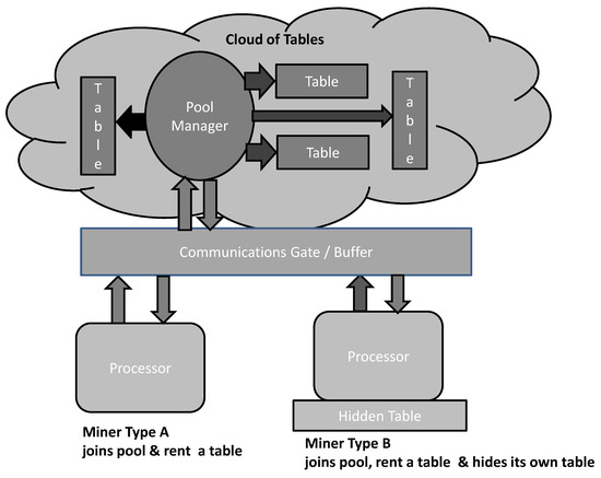 Miners: We assume that both types of miners, Types A and B, perform iterative re-encryptions to generate candidates for the puzzle solution and to deserve the pool mining award. After recalculation, a miner puts the outcome into the buffer at the communications gate and continues with a new encryption round of iterative recalculation by using the current outcome as the new key for encryption of all-ones binary vectors as specified in the puzzle-solving algorithm. For the described activity, the miners receive pool awards assuming that they pass control of dedicated work. In addition, Miner Type B could perform the following malicious activity: In addition to submitting the outcomes of iterative re-evaluations to the pool manager, a Miner Type B could perform a check, employing its own table and the tables it can access, on whether the current candidate provides a solution for the puzzle to reach the block-mining award independently of the pool.