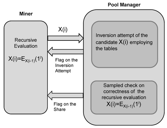 A dedicated employment of this “resources two dimensional” consensus protocol in the pool mining scenario is proposed. The main underlying idea is to separate resources required for puzzle solving between the pool manager and the miners to provide resistance against certain attacks and to heavily reduce energy spending on the miners’ side without introducing an additional space overhead, which is moved to the pool manager as displayed in Figure 1.