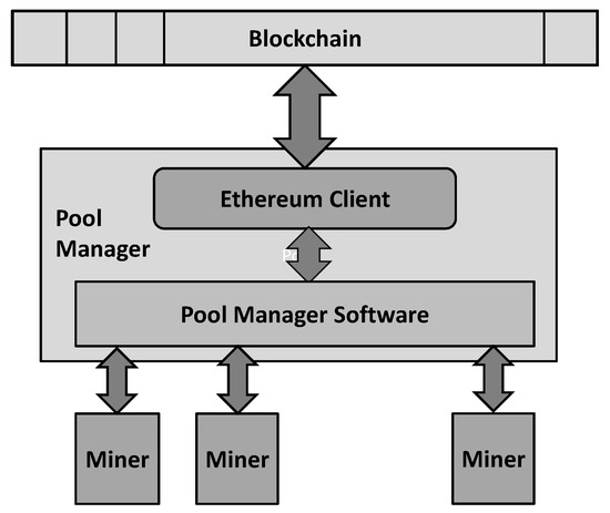 Summary of the Results. This paper proposes and evaluates security, yields an implementation framework, and experimentally considers an approach for pool mining in public blockchain systems. In particular, a novel architecture for pool mining and the corresponding procedure for interaction between a miner and the pool manager are proposed. The proposed architecture provides (i) miners’ flexibility in selecting the resources required for participation in the consensus protocol and (ii) high resistance against the main attacks that could appear within pool mining, such as block-withholding attacks and selfish mining. The architecture is based on employment of the recently reported blockchain consensus protocol [7], with the puzzle based on symmetric key encryption, and employs energy and space resources and appropriate control of these resources. The architecture separates the energy and memory resources between the miners and pool manager in a quasi-symmetric manner and yields power to the pool manager to control access to the memory resources, i.e., tables, which provide substantial efficiency for solving the consensus protocol puzzle. The success rate of pool mining and robustness against malicious miner attacks are considered. A dedicated protocol for communication between a miner and pool manager is proposed. It is shown that the success probability of malicious miners verifying a block could be made arbitrarily small in comparison with the pool success probability, implying robustness against block-withholding attacks and selfish mining. The implementation framework of the proposed architecture is given based on employment of a modified Ethereum platform, where the proof-of-work (PoW) consensus protocol is replaced by the protocol reported by the one based on the energy–memory trade-off. According to the above, in comparison with the previously reported results, this paper yields the following novelties: (i) A different paradigm is employed for providing resistance against the block-withholding and selfish mining attacks: The resistance is incorporated into the consensus protocol oppositely to the previously reported approaches where the consensus protocol and control against the considered attacks are independent issues. (ii) A novel architecture for pool mining is proposed where the miners and the Pool Manager combine their resources for performing the consensus protocol. (iii) The pool mining employs a consensus protocol that provides flexibility concerning the resource selection required at a miner’s side and reduction in the total pool energy consumption. The reported experimental work was carried out as follows: (i) Implementation of a modified Ethereum platform for the pool mining according to the proposed architecture; (ii) in order to prove the feasibility of the proposed mining approach, the experiments were conducted on a platform with an Ubuntu 20.04 operating 536 system that has an Intel Core i7-10750H CPU @2.60 GHz with 12 cores; (iii) experiments have confirmed the feasibility and effectiveness of the proposal.