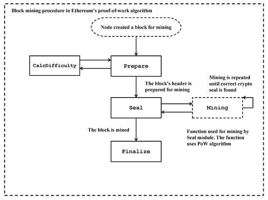 Algorithm A4. The pool manager initializes a new block that is going to be mined by writing various data to the newly created block. Those data include block number, hash of the block’s parent, hash of block’s uncles, and the block’s gas limit. The pool manager also selects and executes transactions from the transaction pool that will become part of the new block.