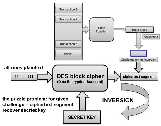 The first step could be considered a mini PoW and could employ the same hash function as employed in Bitcoin and Ethereum consensus protocols. The bits selected in the second step could be from arbitrary positions of the hash vector, and as a particular instantiation they could be a suffix of hash values. The approach employed for construction of the challenge for the puzzle, which should be solved are shown in Figure A1 and displays the following: (i) A number of the transactions and a nonce are organized as a binary vector; (ii) This vector is input to the hash function; (iii) The obtained hash value is subject to decimation, which yields the challenge for the inversion.