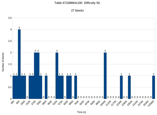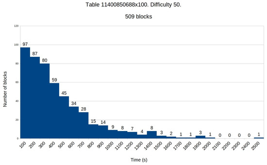 Table 4 shows the experimental results for the mining pool obtained after 56 h of mining. During that time, the mining pool mined 509 new blocks, with the average time needed to find a new block being approximately 393 s. However, the median of times needed for mining a new block was significantly shorter, approximately 290 s, as there were few blocks that required much more time for mining. This can be easily seen from Figure 11, which shows the distribution of blocks per time needed to mine them.