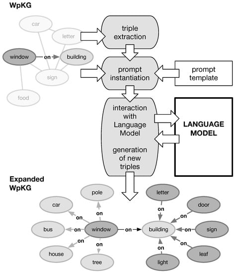 The proposed method is intuitive and straightforward. It starts with interaction with a language model using short texts created based on the commonsense knowledge graph to be expanded. Then, the obtained results, i.e., the retrieved pieces of information and facts, are added to the graph as triples. The overview of the process is illustrated in Figure 2. It shows the WpKG as a graph from which some triples are extracted. The information from these triples is used to instantiate prompt templates (Section 4.3) that represent training data for a language model. The instantiated prompts are entered into the model. As a result, the obtained pieces of information are converted into new triples. These new triples are added to the WpKG, leading to its expansion.