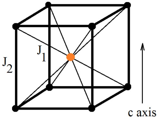 To demonstrate the method, let us follow Ref. [29]: we consider the body-centered tetragonal (bct) lattice with Heisenberg spins. Each spin interacts with its nearest neighbors (NN) via the exchange constant and with its next NN (NNN) on the c-direction via the exchange (see Figure 1).
