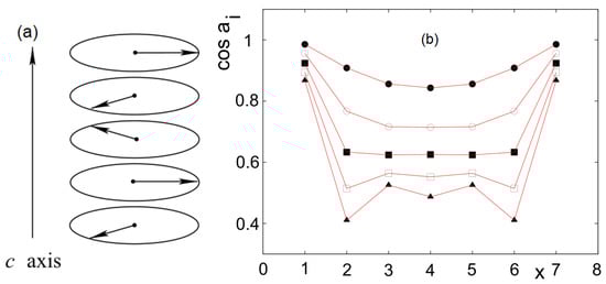 (a) Chiral structure along the c-axis for an infinite crystal, in the case , namely ; (b) Cosine of , …, across the film for several values (from top) with : stands for and x indicates the film layer i where the angle with the layer is shown. See text for comments.