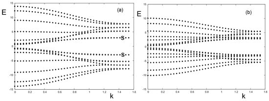 (a) Spectrum versus for at and (b) , for and . The surface branches are indicated by s.