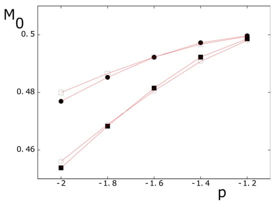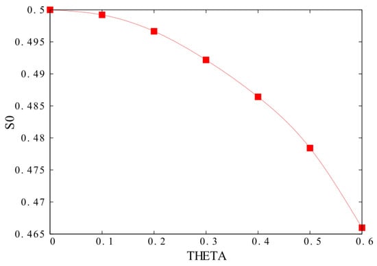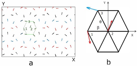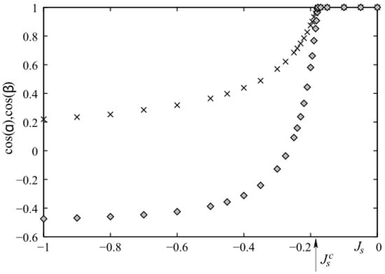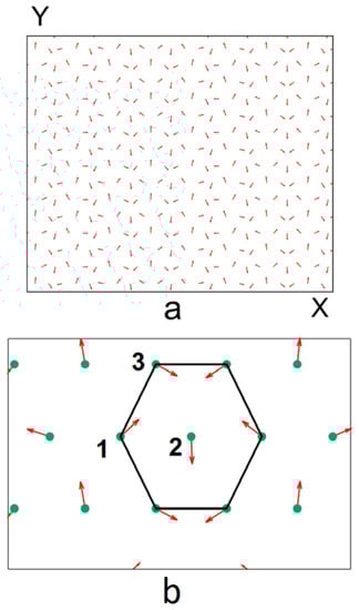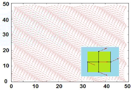 The easiest way to determine the GS is to minimize the local energy at each spin: taking a spin and calculating the local field acting on it from its neighbors. Then, we align the spin in its local-field direction to minimize its energy. Repeating this procedure for all spins, we say we realize one sweep. We have to make a sufficient number of sweeps to obtain the convergence with a desired precision (see details in Ref. [39]). This local energy minimization is called “the steepest descent method”. We show in Figure 8 the configuration obtained for using .