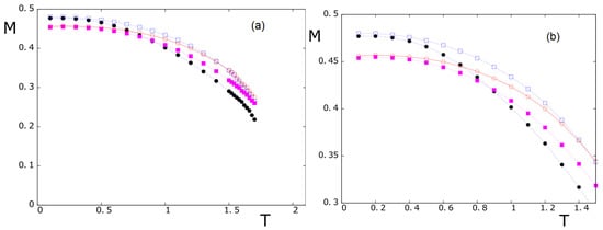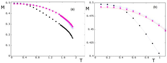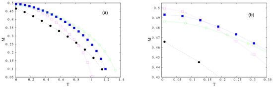 (a) Layer magnetizations as functions of T for with , , (b) Zoom of the region at low T to show crossover. Black circles, blue void squares, magenta squares and red void circles are for first, second, third and fourth layers, respectively. See text.